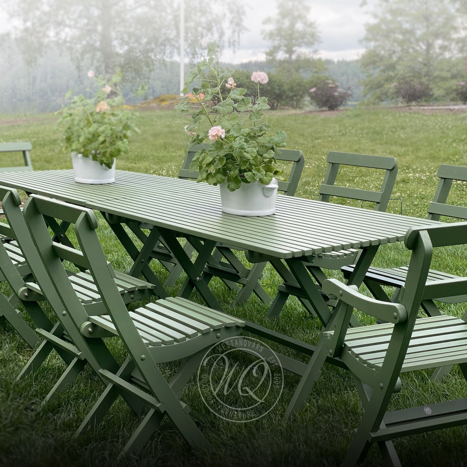 Solbacka är en högklassig utemöbelkollektion i klassicistisk 1920-tals anda. Den är närtillverkad av kvistfri tätvuxen kärnfuru av högsta kvalitet. Möblerna handmålas med äkta linoljefärg som andas och gör att de får en mycket lång livslängd och är enkla att underhålla. Formgivningen är ergonomiskt optimerad för hög sittkomfort. Hopfällbarheten underlättar transport och förvaring. Skruvar och bultar är i rostfritt/A4 stål. Läs mer om hur du underhåller dina utemöbler…