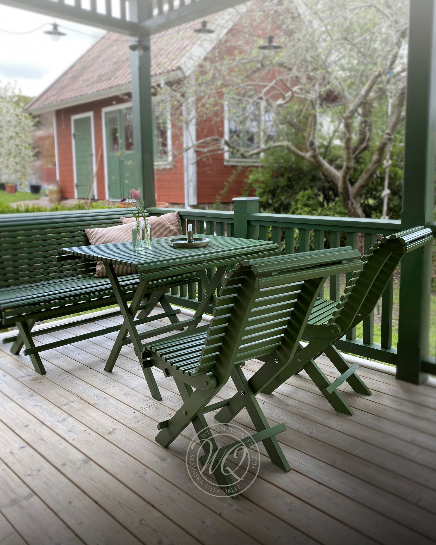 Vackra och hopfällbara trädgårdsmöbler i tidstypisk formgivning kring sekelskiftet 1900. Som hemma i trädgården hos konstnärsparet Karin och Carl Larsson i Sundborn. Möblerna är mycket bekväma att sitta i och de är närtillverkade i vår egen snickerifabrik av kvistfri svensk kärnfuru av högsta kvalitet. De handmålas med riktig linoljefärg som andas och gör möblerna enkla att underhålla och att de får en livslängd som sträcker sig över generationer. Skruvar och bultar i rostfritt/A4 stål. Flera färgalternativ eller eget färgval! Läs mer om hur du underhåller dina utemöbler…